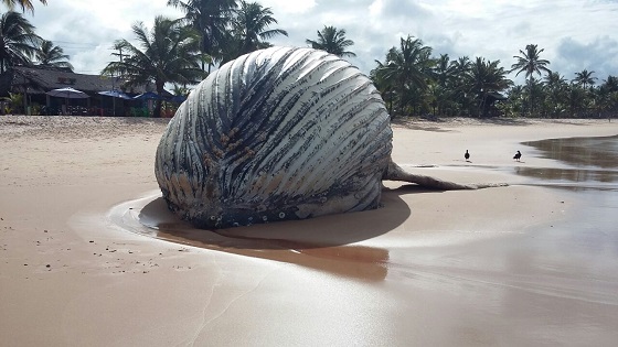 | Baleia jubarte achada morta na praia de Taipu de Fora, na Península de Maraú. |
