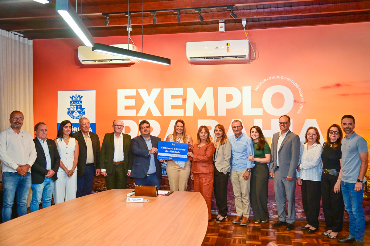 Na manhã desta quinta-feira (15), familiares, colegas de trabalho e amigos do Senhor Valeriano Severino de Almeida compareceram ao salão nobre da Prefeitura Municipal para a entrega da placa que passa a dar o nome dele à antiga Avenida Jardim Guanabara. Falecido em 2020, Valeriano foi presidente do Sicoob Crediconquista, fomentando o cooperativismo e o desenvolvimento econômico da cidade.