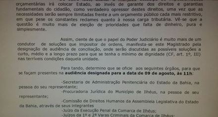 O juiz da 1ª Vara da Fazenda Pública de Ilhéus, Alex Vinicius Campos Miranda, marcou para o próximo dia nove de agosto uma audiência de conciliação que terá como pauta o pedido do Ministério Público e da Defensoria para interditar o modulo 1 do presidio Ariston Cardoso.