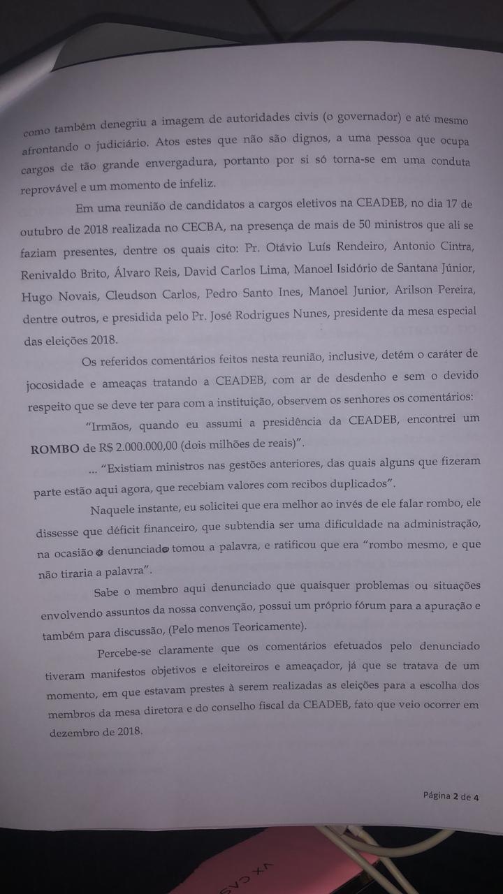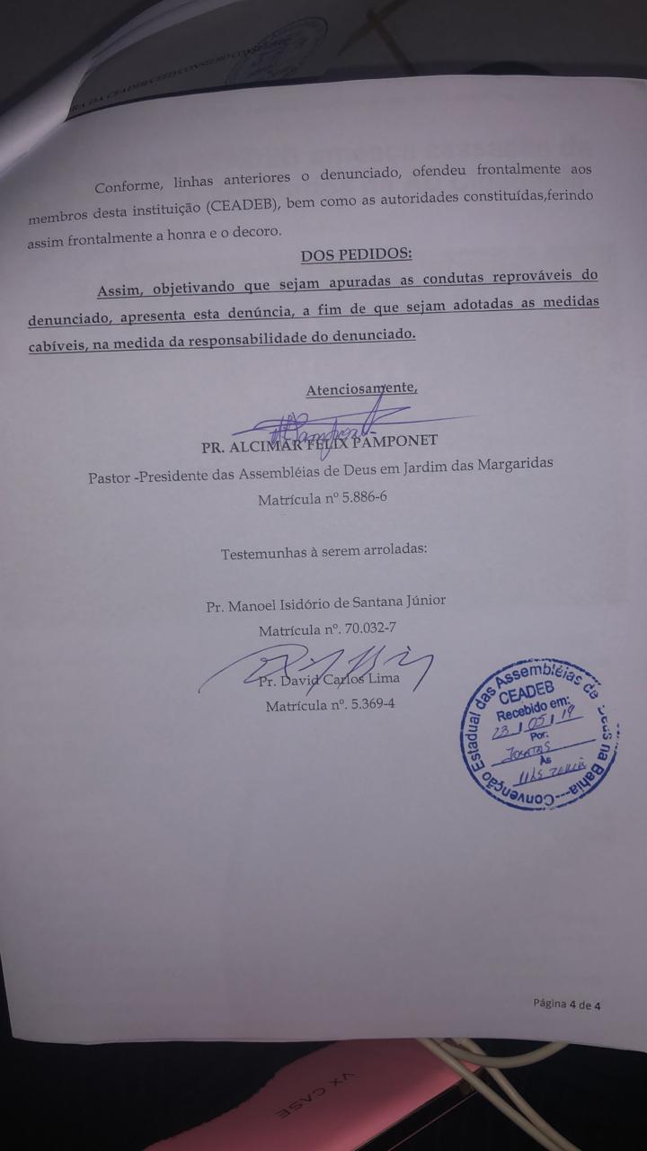 Os documentos acostados na presente denúncia, e as provas colacionadas, o Ministério Público Estadual e a Polícia Federal receberam gravíssimas denúncias contra o pastor Valdomiro Pereira, por práticas delituosas, tendo o mesmo cometido também injúria, calúnia, difamação, improbidade administrativo e corrupção, tendo ainda praticado atos lesivos á moral e os bons costumes, sendo alvo de várias denúncias amplamente divulgado na imprensa local e nas redes sociais, além de ter sido intimado a comparecer na Delegacia de Polícia na Itinga-Lauro de Freitas-Ba. Tais condutas praticadas pelo denunciado fere totalmente o Estatuto da referida instituição.
