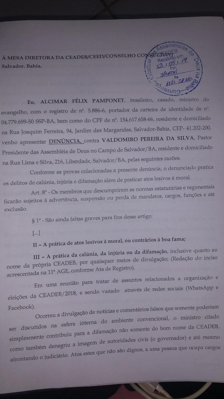 O pastor presidente da Assembléia de Deus em Salvador e presidente da CEADEB – Convenção Estadual das Assembleia de Deus na Bahia Valdomiro Pereira da Silva, foi denunciado no Conselho de Ética e no Conselho Consultivo, órgãos de punição para pastores que cometeram crimes e pecados.
